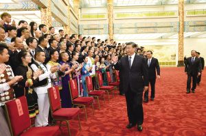 演出開始前,習(xí)近平等黨和國(guó)家領(lǐng)導(dǎo)人會(huì)見了文藝會(huì)演演職人員代表、組委會(huì)成員、56個(gè)民族的優(yōu)秀基層黨員代表等,并同他們合影留念。