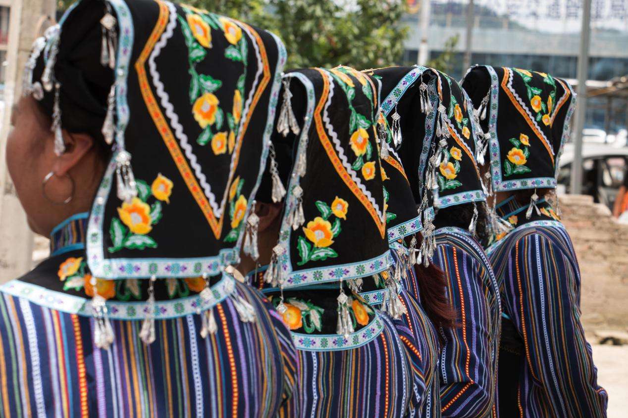 沙坡村布依族女性的傳統(tǒng)服為,頭戴黑色打底的方巾,方巾上繡有大面積花圖案作為裝飾,在方巾周邊還繡有花邊,花邊處串連有銀飾作為裝飾。上身主要為黑色打底的條紋對(duì)襟衣和圍腰,上衣肩頸處繡有花朵圖案,圍腰上部也繡有大面積花草圖案,兩袖袖口處同樣也繡有花草圖案。下身則以黑色打底的百褶裙為主,百褶裙底部繡有條紋圖案?! ?/p>