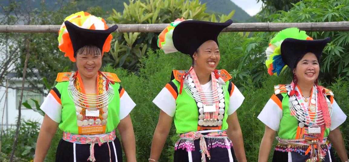 五星村苗族女性服飾顏色亮麗,做工精細(xì)。女子頭戴黑色百褶帽,百褶帽形似一只船,在其尾部還裝飾有用絲巾制作而成的花朵。上身則多以黃綠色打底的對襟短衣,對襟處繡有花紋圖案作為描邊,對襟上裝有銀飾圓牌。女子胸前還大多佩戴銀項(xiàng)圈,身后則穿戴背牌。背牌做工極為精細(xì),刺繡圖案豐富。圖案多以幾何和花草為主,背牌上部裝飾有兩排對稱的銀牌,左右也裝飾有對稱的銀鎖。背牌中部是一個倒三角銀飾,銀飾上雕刻有蝴蝶圖案。女性服飾下裳主要分為三個部分,底部為黑色打底長褲,中層為黑色打底的百褶裙,上層則為黑色打底的圍腰。圍腰底部繡有花紋圖案裝飾,圖案內(nèi)容多以花草為主。腰部系有腰帶,腰帶上刺有花紋圖案且顏色較為鮮艷。女性服飾身后還垂有四條絲帶,絲帶上也繡有大面積的花紋圖案,服飾整體充滿民族氣息。