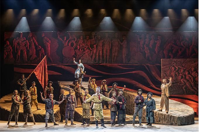 在舞蹈語(yǔ)言的設(shè)計(jì)上,編導(dǎo)融入當(dāng)代元素,使觀眾不但感受到審美的親切與現(xiàn)代感,而且還自然地進(jìn)入回望歷史的情境,對(duì)其思想內(nèi)涵的理解更為準(zhǔn)確。該劇的道具使用和調(diào)度也頗為大氣,令人印象深刻。一組斜坡?tīng)畹拇笮臀枧_(tái)道具不但由群眾演員直接移動(dòng)而實(shí)現(xiàn)即時(shí)的場(chǎng)景調(diào)度,還可使演員上下和左右而行,最終組合成巨大的中國(guó)共產(chǎn)黨黨徽,輔助完成了人民英靈和英雄的形象塑造。