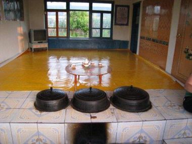 朝鮮族傳統(tǒng)民居建筑主要采用燒炕的采暖方式。一般有多大的屋子,就有多大的炕,這點(diǎn)與東北地區(qū)的漢族與滿族類似。一般在早上燒兩灶就可以維持一天,冬天非常溫暖,朝鮮族人們可以在炕上進(jìn)行任何活動(dòng)。