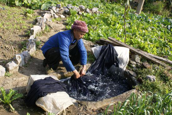 從前壯族鄉(xiāng)村,普遍掌握制作藍(lán)靛及印染方法。一般置一大缸,將藍(lán)草放入浸泡,加石灰使之分解、發(fā)酵,經(jīng)過化學(xué)變化,而后濾去殘?jiān)?,蒸發(fā)水分,凝成糊狀藍(lán)色染料。其間需不斷攪動,使色素充分化解。“每靛草六百斤,造成一百斤之靛為佳?!币虍a(chǎn)量較多,遠(yuǎn)銷廣東。浸染時(shí),將適量靛糊化于染缸中,同時(shí)將雞血藤搗碎加入。布要反復(fù)浸泡多次,晾泡結(jié)合,直到染為深藍(lán)色。其間雞血藤釋放出一種紫紅色的植物膠,將藍(lán)靛色素粘在纖維上,是色素耐水耐腐耐紫外線,不易褪色,并有若隱若現(xiàn)的亮點(diǎn),結(jié)實(shí)美觀。這個(gè)過程,運(yùn)用了化學(xué)分解法。