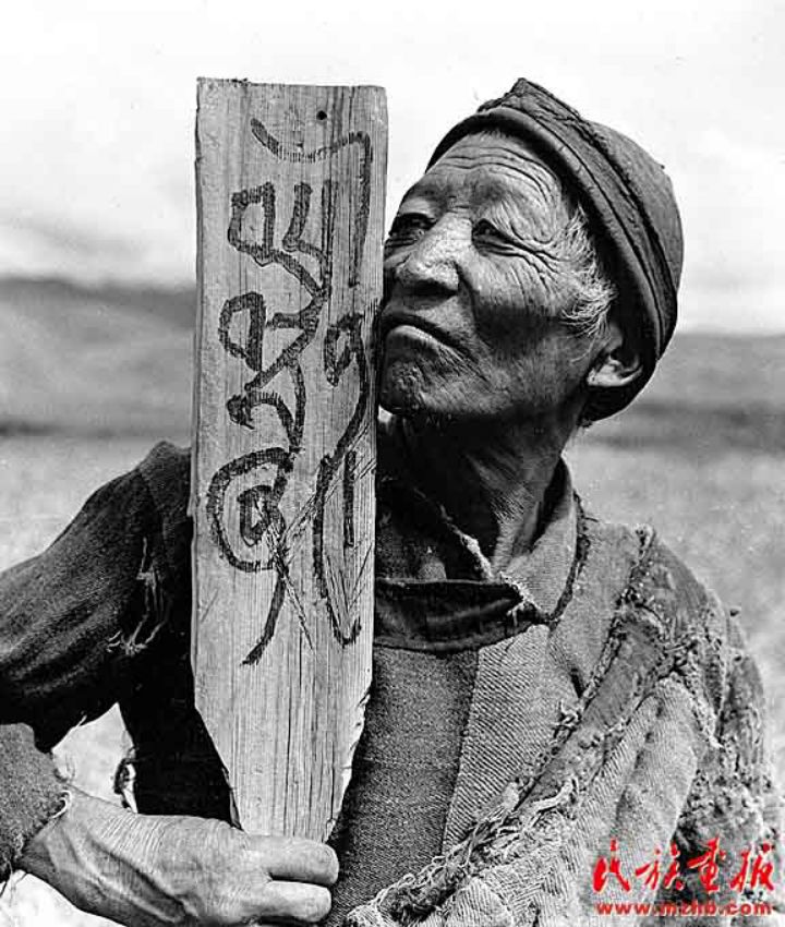 1959年,翻身的農(nóng)奴第一次擁有自己的土地,桑登手里拿著寫有“桑登的土地”的木牌久久不愿放下(藍志貴 攝影)