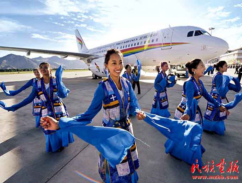 西藏已經(jīng)建成使用的機場有拉薩貢嘎國際機場、阿里昆莎機場、昌都邦達機場、日喀則和平機場和林芝米林機場。西藏還擁有自己的航空公司,圖為西藏航空有限公司成立暨首航儀式