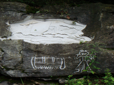 筆者在該村所見的具有“文化生態(tài)村”建設(shè)痕跡,除了村口巨石上鐫刻的文字外,還修建了一條貫通項(xiàng)目組專家們規(guī)劃的“文化生態(tài)展示區(qū)”的石板路,并在作為展示重要文化景觀的地方豎立了介紹或解釋性的文字標(biāo)牌。如,村口、山神廟前、摔跤場等都立有介紹的招牌。讓筆者疑惑和認(rèn)為不應(yīng)該“改造”的是在村民們的祖靈洞巖壁上的“藝術(shù)石刻”(見圖)。從筆者與村民的訪談和項(xiàng)目組的總結(jié)報(bào)告資料中,可以把文化生態(tài)村建設(shè)試點(diǎn)項(xiàng)目組在月湖開展的文化保護(hù)工作歸結(jié)為如下幾個(gè)方面: