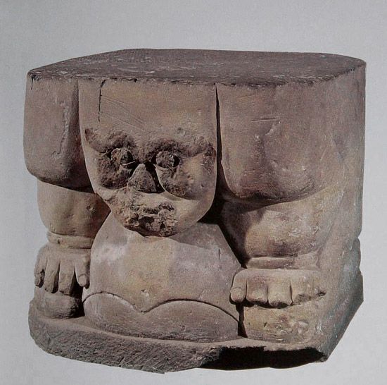 圓雕,白砂石質(zhì),近似正方體。圓雕男性人像,面部渾圓,顴骨高突,粗眉上翹,雙目圓睜且外突,鼻梁短粗,獠牙外露,下頜置于胸前,裸體,腹有肚兜,肩于頭齊,肘部后屈,雙手扶膝,下肢屈跪,背部平直。座頂左上角陰刻西夏文三行,計15個字。第一行4字漢譯為“小蟲曠負”;第二行4字漢譯為“志文支座”;第三行7字漢譯為“瞻行通雕寫流行”。背部陰刻漢文一行6字“砌壘匠高世昌”,為西夏石雕工匠的姓名,彌足珍貴。雕像以夸張的手法表現(xiàn)了負重者的神態(tài),反映出西夏時期石雕藝術(shù)的獨特風格。迄今在西夏陵區(qū)多座帝陵的碑亭遺址中,已出土這類支座14件,但刻有西夏文字的僅此一件。
