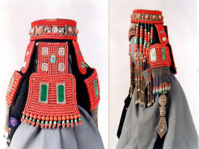 簡介:民族文化宮博物館收藏的這件銀飾“孔雀衣”,是景頗族女子盛裝時的一種服飾,征集于云南省德宏傣族景頗族自治州隴川縣,時間為20世紀50年代。這件銀飾“孔雀衣”長40厘米,胸圍108厘米,黑色平絨布制作而成,圓領對襟,領部、肩部和胸部墜銀泡、銀鏈、銀穗裝飾,黑白兩色相映成趣,精致華美。[詳細]