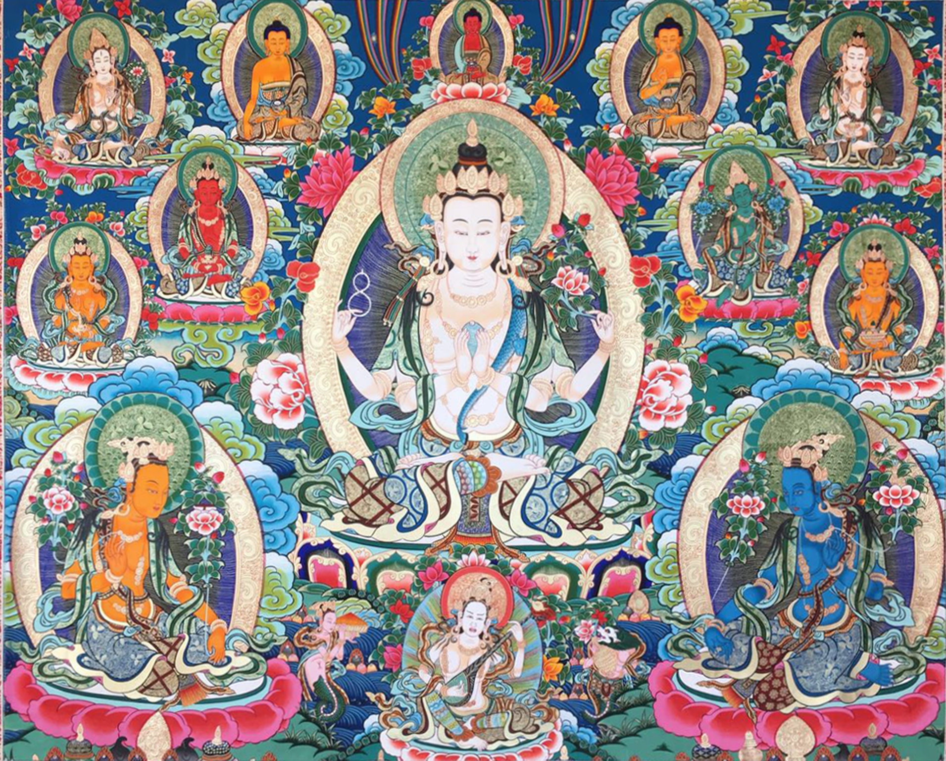 四臂觀音是觀世音菩薩的化身之一。四臂觀音是雪域高原的守護(hù)神,其咒語為“嗡嘛呢唄咪”,即“六字真言”或稱“六字大明咒”。藏傳佛教認(rèn)為,持六字大明咒,可心消除病苦、刑罰、非時(shí)死之恐懼,壽命增加,財(cái)富充盈。