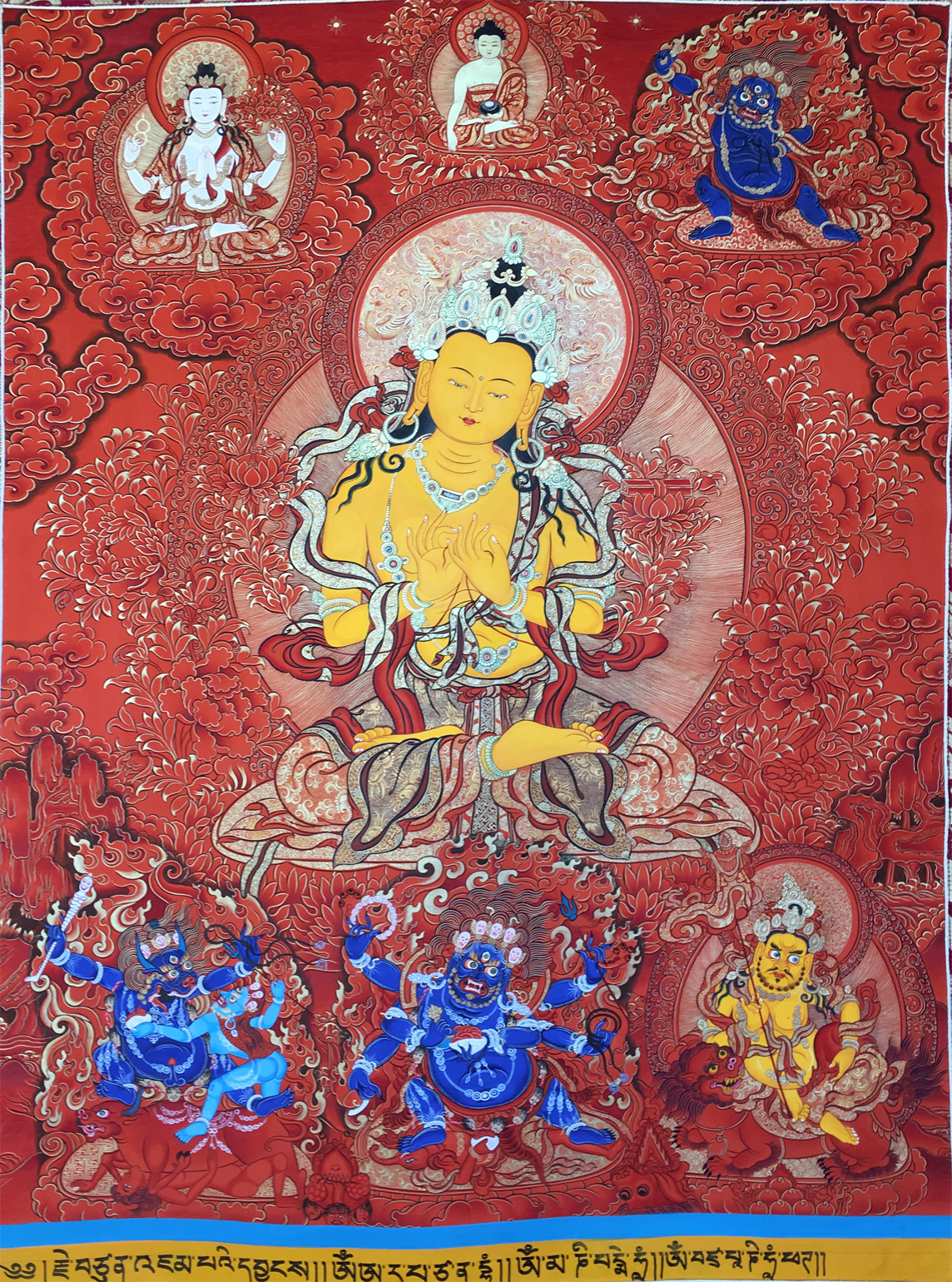 所乘之獅子,象征其威猛。文殊菩薩是如來佛祖怙恃之一。唐卡的原料是以純金、純銀、珊瑚、綠松石作為主要顏料、也可以是諸石朱砂、鉛粉或黃德粉這些普通顏料、正宗的唐卡可以收藏數百年而不褪色、具有極強的收藏價值。