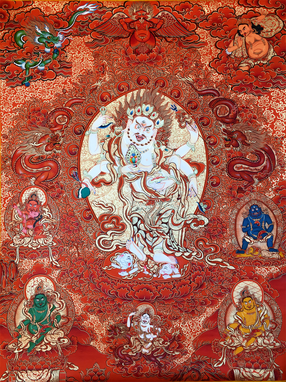 六臂白瑪哈嘎拉正名為白如意珍寶依怙主 。首宏於香巴噶舉,后另傳至薩迦派分支,為特別不共法門,是求財的智慧護法,相傳此尊住於印度清涼尸陀林。此尊身白色,一面六臂三目,須眉毛發(fā)金黃,獠牙外露卷舌相。頭戴寶冠,珍寶瓔珞,天衣彩裙為身莊嚴,身材短胖,并有小鈴華蔓為飾。兩腳作巡行狀,踏於持寶鼠之白象王財神之背。