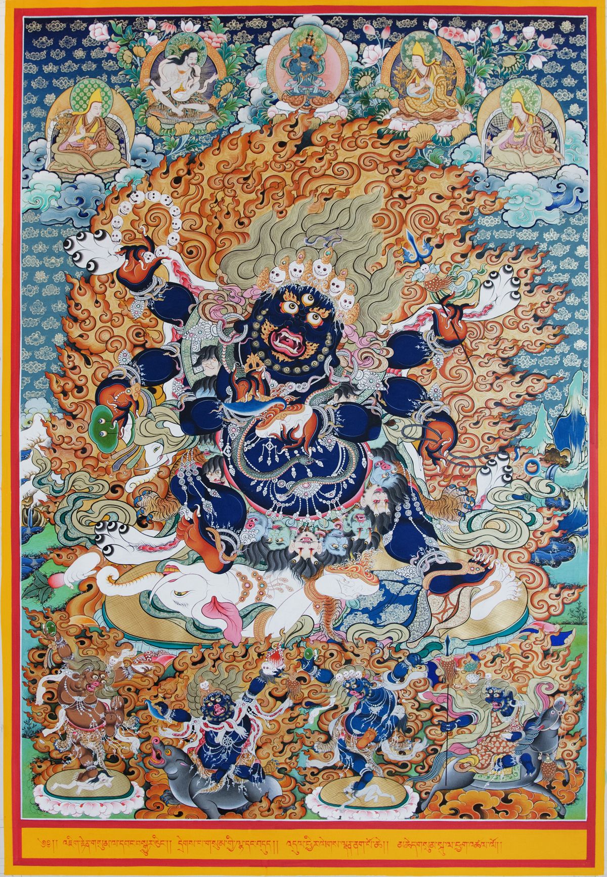 他面容猙獰恐怖,獠牙外露,三目圓睜怒視。頭發(fā)向上直立,眉間點(diǎn)有朱砂“仙都那”印記(梵文Sindura),象征一切空行之懷懾力量。頂戴五骷髏冠,項(xiàng)配五十新鮮頭顱。如果仔細(xì)觀看唐卡中護(hù)法頭部頂端,飾有一個(gè)小小的金剛杵,這是用來象征不動金剛。