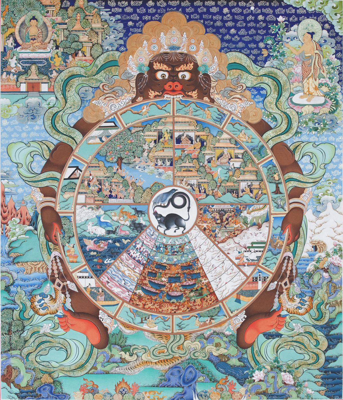 一切有情,皆以諸欲因緣,自作自受,如車輪回轉(zhuǎn)不已,生死于六條道趣,接受制裁。所謂六道,即:人、天(化生)、阿修羅(魔)、地獄、餓鬼、畜生(三惡道)。然在六道中,卻以人道為中心,因人心的善惡觀念而隨心所欲的去追求,造成報(bào)果。如人在日常中的語(yǔ)言、動(dòng)作、思想,守法實(shí)踐持三戒(五戒:不殺生、偷盜、邪淫、妄言、飲酒)以上者,可得六根整然的人身,五戒圓備者,即生大富大貴之家,長(zhǎng)壽而揚(yáng)名于世。修持五戒,加行十善(身:不殺生、偷盜、邪淫??冢翰粣嚎凇⑼?、綺語(yǔ)、兩舌。意:不貪、瞋、癡。),即生天界,天分為欲界天、色界天、無(wú)色界天。上述五戒加十善,乃生欲界天,再加修正觀坐禪,證初禪至四禪,即生色界天。趨入四空定,即生無(wú)色界。但雖至非想非非想天,還是降伏業(yè)惑而已,無(wú)法脫離生死輪回,故古人說(shuō):三界無(wú)安,猶如火宅。如果人于日常生活中,雖有十善心布施,但帶有名利好勝,即生阿修羅界(須彌山腰),阿修羅是具天福而缺天德,因地污曲所致。如果人于日常中,失去道德戒行,生起慳貪心,即墮餓鬼道界,生起瞋癡心,即墮畜生界,犯五逆十惡者,即墮地獄界。以上釋義引自《君友會(huì)、六道輪回卷》綜上:六道輪回的善惡報(bào)趣,盡在人心的一念,能趨于善,即上升天界,起一念惡,即墮惡道,因果昭彰。