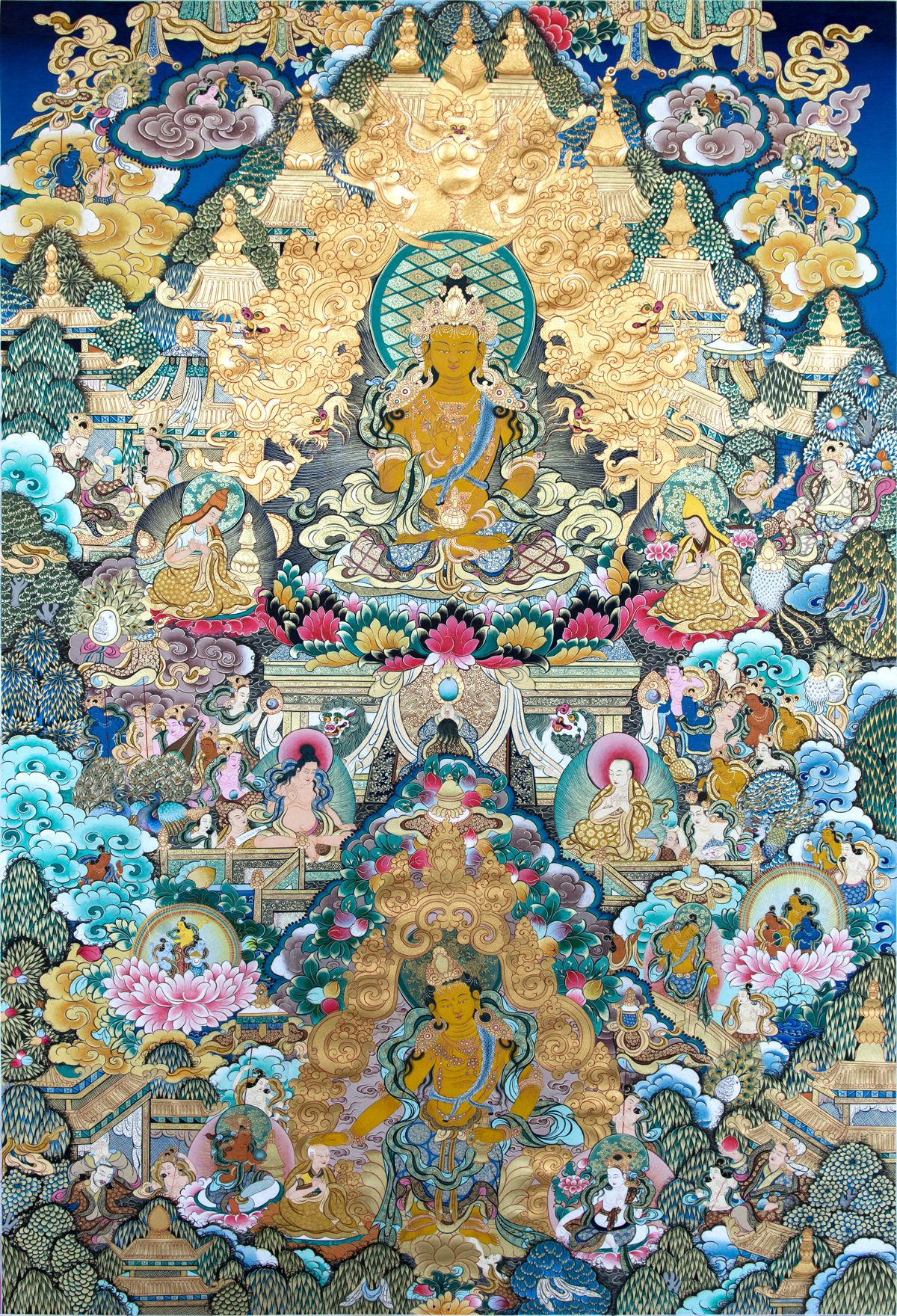主尊未來世界彌勒佛菩薩,左邊描繪了噶當(dāng)派創(chuàng)世者阿底峽尊者與他的弟子。右邊描繪了格魯派的創(chuàng)世者宗喀巴大師與兩大弟子克主杰和迦側(cè)杰,中部周圍供奉者八大隨喜菩薩文殊菩薩、普賢菩薩、觀世音菩薩、金剛手菩薩、虛空藏菩薩、地藏菩薩、彌勒菩薩、除蓋障菩薩,畫面四角供奉為彌勒佛未來世界的迎接與弘揚佛法的情景。畫面上空描繪了仙女四處飛揚,空中漂浮著吉祥的圖案與神秘的瑞相等等。整體畫完之后選擇一個殊勝吉祥的日子點所有諸佛的五官,發(fā)髻、手勢、法器、畫面后部畫家要親自寫聲、語、法的字號。作品完工之后寺院里進行眾多活佛和高僧大德的加持與開光儀式。