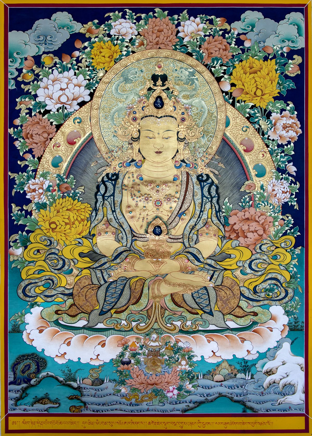 長(zhǎng)壽佛(梵名Aparimita āyur jnāna su-vinisˊicita tejo rājāya tathāgata),在漢譯佛經(jīng)中無(wú)其形象之記載描述,藏傳佛教中其畫像為一面二臂,肌膚紅色,盤發(fā)成髻戴五佛寶冠,上穿天衣,下著綢裙,身佩珍寶瓔珞,具足一切報(bào)身佛的種種莊嚴(yán),雙手結(jié)禪定印于膝上,托長(zhǎng)壽寶瓶,雙足以金剛雙跏趺安住于蓮花月輪上。
