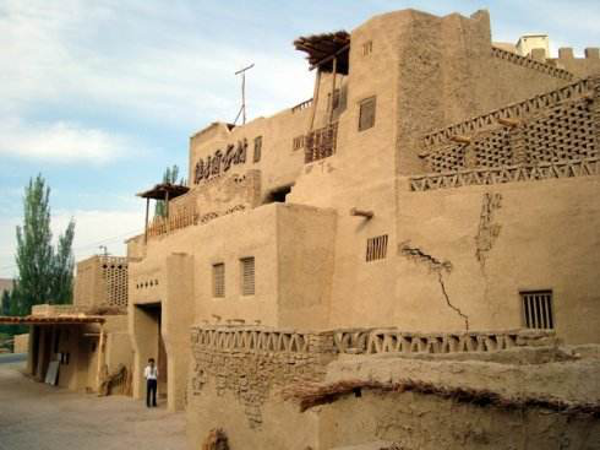 維吾爾族的居室一般是土木結(jié)構(gòu)平房,其建筑方式是以粗木或沙石作基,土塊砌墻,或笆子墻,房頂架梁檁、椽后鋪葦席加土抹泥。房屋平頂,開天窗采光,四壁不開窗只留門,房門忌朝西?,F(xiàn)在,建筑式樣發(fā)生變化,多留壁窗,建材也多由土木結(jié)構(gòu),向磚、混凝土結(jié)構(gòu)發(fā)展。室內(nèi)布置過去較為簡單,一般多砌土炕,炕一側(cè)隔矮墻砌鍋臺,墻上留有壁翕,放置物品,喜掛壁毯。冬季多燒爐子、火墻取暖。院內(nèi)多植有葡萄和果樹花卉。房門口兩側(cè)砌土臺,上鋪氈毯,用以夏天乘涼、睡覺。
