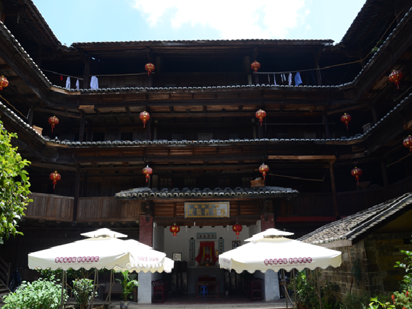 一座土樓就是一個藝術殿堂。每一座土樓,又如同一個“大家族,小社會”。土樓內(nèi),居住在同一屋頂下的幾十戶幾百人同祖同宗同血緣同家族,過著共門戶、共廳堂、共樓梯、共庭院、共水井的和睦生活。這種聚族同樓而居的生活模式,典型地反映了客家人的傳統(tǒng)家族倫理和家族的親和力。而且,樓內(nèi)的客家人,住著層數(shù)相同、開間面積相等、無明顯朝向差別、更無貴賤等級之分的均等居室。平等聚居,反映了客家人融洽和睦的家風和平等團結的傳統(tǒng)。