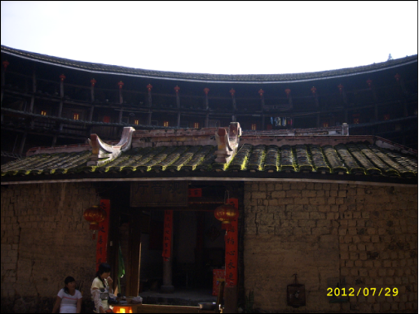 土樓和長城差不多,是用糯米、石灰、蛋清和泥土混合而成的外墻,內(nèi)部是用黃木和杉木,夏可抵暑氣,冬可抵冽風,還可自動調(diào)節(jié)室內(nèi)的溫度。