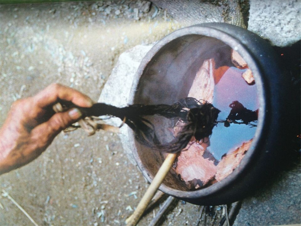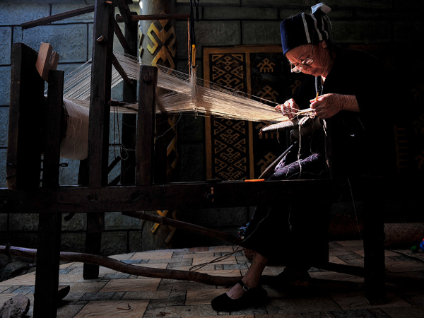 “織”是指使用踞腰織機(jī),采用通經(jīng)斷緯的紡織方法織出各種花紋圖案,在織布時(shí),先手工掛經(jīng),綁住藤或樹(shù)皮布腰帶,用腳踩織機(jī)的經(jīng)線木棍,席地而坐織布??椈ㄊ怯煤谏蛩{(lán)黑色做底線(經(jīng)線),根據(jù)圖案需要,將各種染色的線搭配,拉經(jīng)線、投緯線(彩色線),用木刀打緊緯線,織出各種花紋圖案。