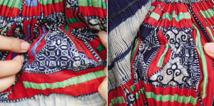 王明芬制作的百褶裙及其局部蠟染紋樣。