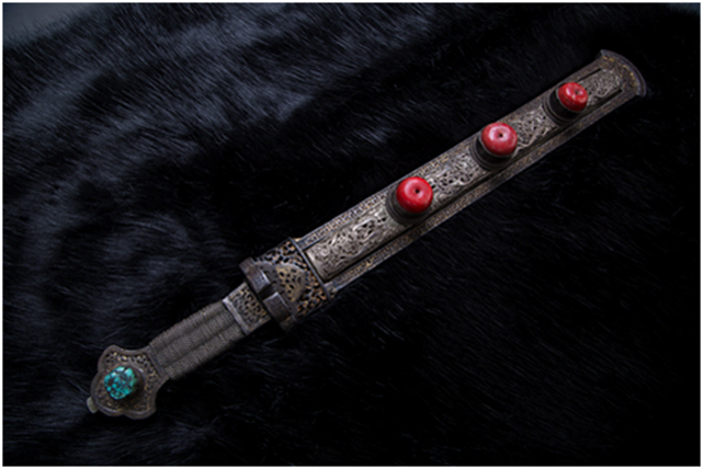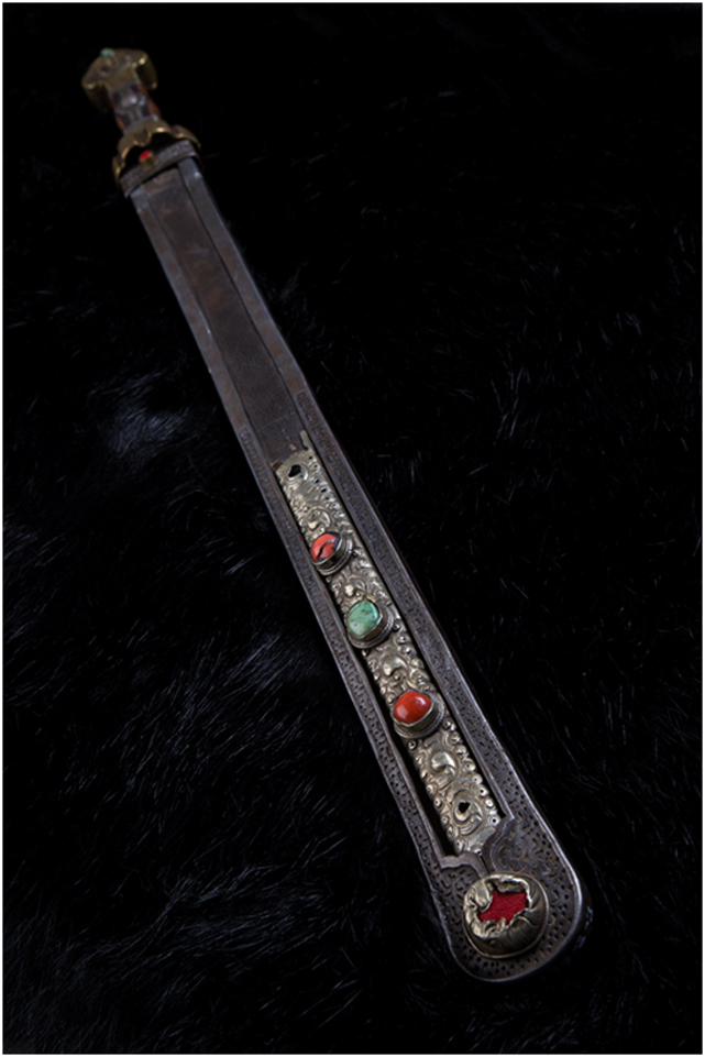安多地區(qū)主要以放牧為主,牧民的刀主要用于宰殺和吃肉,有嚴(yán)格的男用女用之分,男式刀長(zhǎng)度在一尺以上,女式刀在一乍左右,刀鞘的底部和刀柄的末端上翹,呈船形。安多人喜歡珠寶,頭飾、胸飾、腰飾無不光燦耀人,這些飾物同樣被用在刀上,刀鞘和刀柄錨金錯(cuò)銀,鑲嵌著珊瑚和綠松石,像精美的藝術(shù)品。
