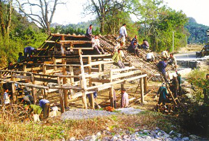 筆者看到的干欄式木樓和吊腳樓在使用的功能上相差無幾,上層住人待客,樓下四壁用木板圍擋,圈養(yǎng)畜禽,存放燒柴、農(nóng)具和秋收臨時(shí)堆放的糧食。豬圈靠里側(cè)依柱圍欄,其它空閑的地方打掃得干干凈凈,有的將織布機(jī)放在樓下明亮的地方。住房一般5間,兩頭兩間是偏廈,中間3間是寬敞的堂屋,一頭設(shè)火塘、土灶,為烤火、煮飯之處;另一頭的中柱供臨時(shí)設(shè)席敬神之用,也有的在板墻上設(shè)佛龕神位,供奉祖先;臥室依房柱用木板靈活隔間。大門有的開在房山墻一側(cè),也有開在中間的,皆登石階、板梯而上。吊腳樓一棟挨著一棟,小巷道曲折狹窄,只容牽牛和順向挑擔(dān)通過。