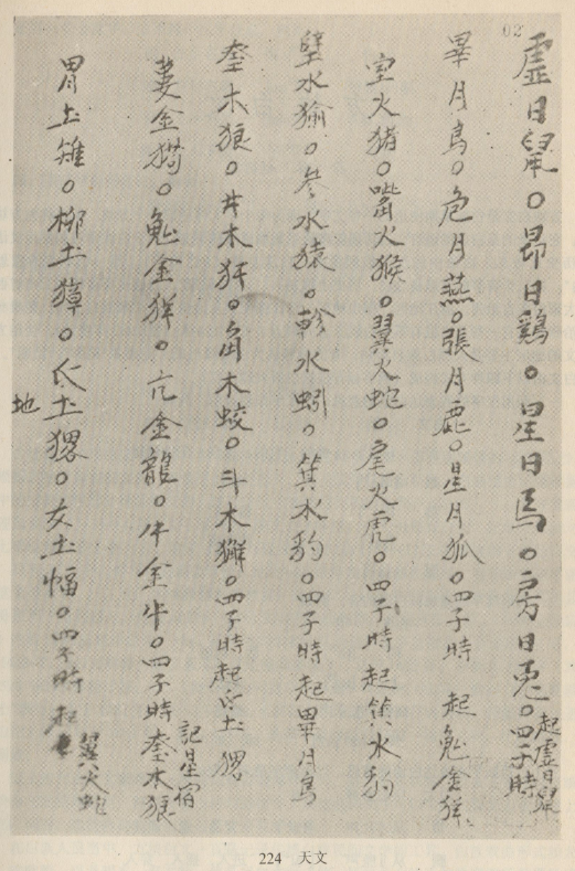 水書(shū)天文書(shū)抄本。寫于民國(guó)年間。書(shū)于白皮紙上,從右至左直寫,高36厘米,寬26厘米,共39頁(yè)。圖中為星象名稱。皆借漢字諧音,由此可窺察水族文字的發(fā)展?fàn)顩r。原件存北京圖書(shū)館。