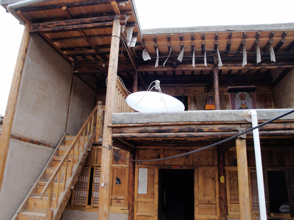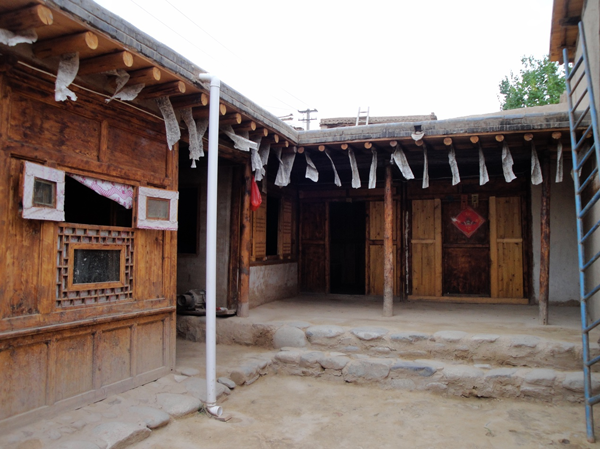 為改善狹小的寨內(nèi)空間,當(dāng)?shù)鼐用窬藿硕幽窘Y(jié)構(gòu)樓房,和青海鄉(xiāng)村民居庭院寬敞的特點(diǎn)形成了反差。寨內(nèi)民居庭院多為四合院式,房屋為土木結(jié)構(gòu)平頂房,一般民居都有飛椽花藻之類。屋內(nèi)一般以木板作隔扇,室內(nèi)有護(hù)炕木板、護(hù)墻木板墻圍,且多雕花草于其上。房屋一般面闊三間,正面以木板隔墻并裝上木板條方格小花窗。佛堂設(shè)在二樓,佛堂所在的房屋一般都是上房,和佛堂不同向的兩邊廂房一般做臥室。院落中央一般都有豎掛經(jīng)幡的旗桿,還設(shè)有桑臺(tái),具有明顯的藏式特點(diǎn)。