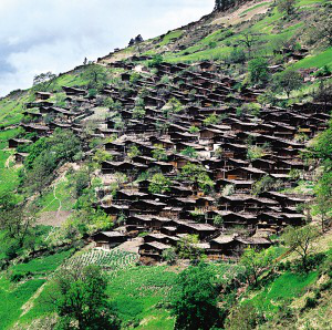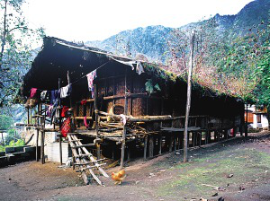 在怒江上游峽谷聚居的傈僳村寨都建在高山的半山上,其民居俗稱(chēng)為“千腳落地房”。說(shuō)“千腳落地”雖有些夸張,但也足以形象地說(shuō)明峽谷溫?zé)岬臍夂蚝蜕礁咂露傅牡乩項(xiàng)l件。在雨季時(shí),“千腳”阻力最小,使山洪順利傾瀉而下,又很快干爽,免受潮氣。而且不需挖地動(dòng)土,不必移石砌墻,對(duì)木料沒(méi)有過(guò)高要求,長(zhǎng)短皆用,在生態(tài)脆弱的高山峽谷也算環(huán)保建筑?!扒_落地”是因建房時(shí)先在確定的屋基上依斜坡程度和住房面積打進(jìn)數(shù)十根到百余根木樁為基樁,以保證居室樓板的平正?;鶚洞蚝煤?,除四面留幾根高柱作為整個(gè)房屋的立柱外,在密集木樁所形成的平面上滿鋪竹篾編織的樓板,還有竹篾圍墻,所有結(jié)構(gòu)皆用竹篾綁扎。屋頂鋪苫草或蓋木片瓦,近幾年,已陸續(xù)換上了大塊的水泥波形瓦。房門(mén)開(kāi)在山墻一側(cè),有廊道,可做曬臺(tái),平時(shí)穿的衣服都搭在這兒,也是婦女做針線活的地方。隨著怒江峽谷的開(kāi)發(fā)和新農(nóng)村建設(shè)的深入,通路的村寨將很快會(huì)改變面貌。