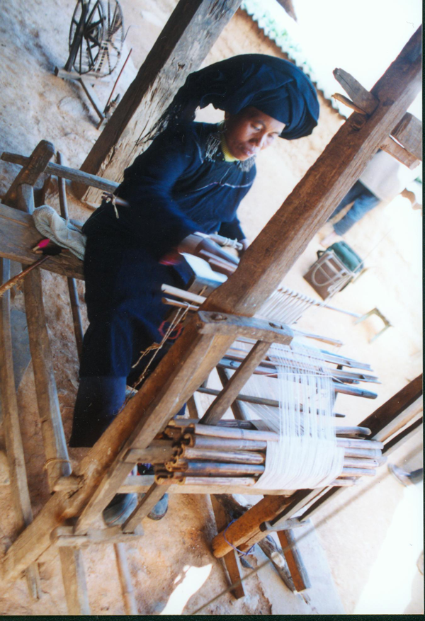 ?。?)染色。布朗族的印染技術(shù)比較單一,所使用的染色原料是自家栽種的藍(lán)靛和各種野生植物。根據(jù)所需顏色采用不同的植物,如染藍(lán)色取自藍(lán)靛,染黃色取自黃花汁。制作靛墨的程序是用水把藍(lán)靛的葉、莖泡化,撈去渣滓待其沉淀。染布時(shí),再配上一種樹皮,一起置于鐵鍋熬成藍(lán)汁,然后將白線或白布放入鍋中,反復(fù)熬煮幾次即成藍(lán)線或藍(lán)布。