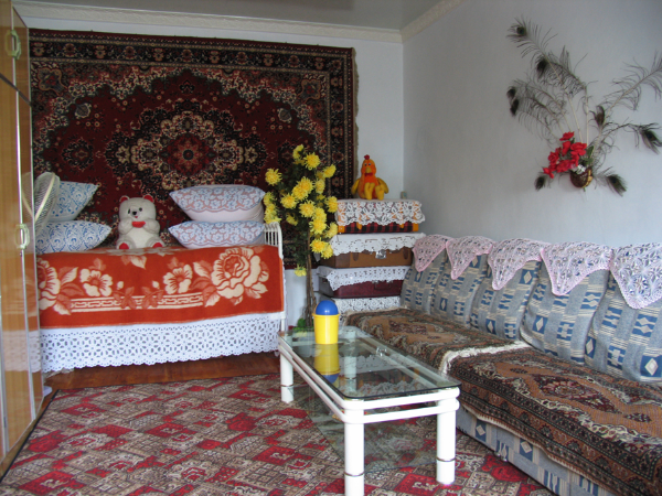 木刻楞房的室內(nèi)結(jié)構(gòu)一般有客廳、臥室、廚房和儲(chǔ)藏室四部分構(gòu)成,房屋的整體結(jié)構(gòu)呈四方形,建造有傾斜度較高的屋頂,利于雨雪不會(huì)覆蓋在屋頂,從而造成屋頂承重過(guò)高而發(fā)生坍塌。此外,俄羅斯族人一般都會(huì)選用紅色、藍(lán)色或者綠色的鐵皮將屋頂精心包裹一番。這不僅可以起到很好的防風(fēng)御寒、防止雨雪滴漏進(jìn)室內(nèi)的效果,而且也使木刻楞房色彩十分和諧艷麗。房屋的正門(mén)之前一般會(huì)建造寬闊的門(mén)庭和圍廊,門(mén)內(nèi)有過(guò)道,過(guò)道兩旁是臥室和客廳。室內(nèi)的墻角有土坯壘砌的火墻。有的人家是大型壁爐,外包一層鐵皮,鐵皮上抹一層黑油,俗稱“毛爐”,是很好的取暖設(shè)備。室內(nèi)陳設(shè)比較講究,臥室擺放著木床或鐵床,鐵床欄桿雕有花草圖像,給人以古雅之感。木刻楞房室內(nèi)一般會(huì)在地面鋪上木地板,俄羅斯族人們也十分喜愛(ài)在家中鋪設(shè)飾有各類花紋圖案的地毯。