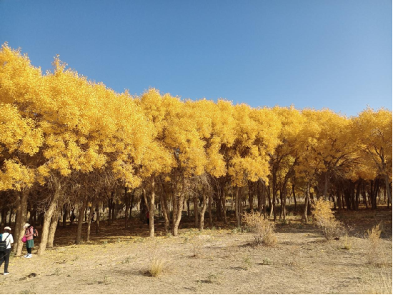 每當(dāng)深秋季節(jié),胡楊樹葉變得一片金黃,形成胡楊秋色,樹影婆娑,奇妙絕倫,賞心悅目。漫步在濃郁的胡楊林中仿佛進(jìn)入神話般的仙境。茂密的胡楊千奇百怪,神態(tài)萬般。粗壯的幾人難以合抱,挺拔的七、八丈之高,怪異的似蒼龍騰越,似虬蟠狂舞,令人驚奇不已,嘆為觀止。僅就密密匝匝的樹葉,也是風(fēng)采獨(dú)有。幼小的胡楊,葉片狹長而細(xì)小,宛若少女嫵媚的柳眉,人們常常把它誤認(rèn)為柳樹;壯齡的胡楊,葉片又變成卵形、闊卵形或三角形,猶如興安嶺的白樺;進(jìn)入老年期的胡楊,葉片才定型為橢圓形。更令人稱奇者,在同一棵胡楊樹冠的上下層次,還長著不同形狀的葉片,因此,又稱“異葉楊”