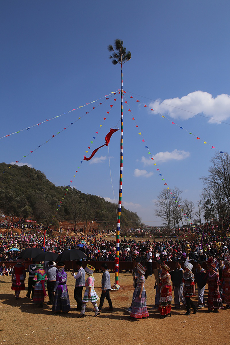女人傘下唱著:“漢人過年漢人出山,苗族過年燒香焚紙祭花桿;漢人過年漢人燒火地,苗族過年全都到花桿前相聚。哎—,小帥哥呃,小帥哥,花桿就樹在那山坡?!?/p>