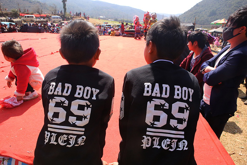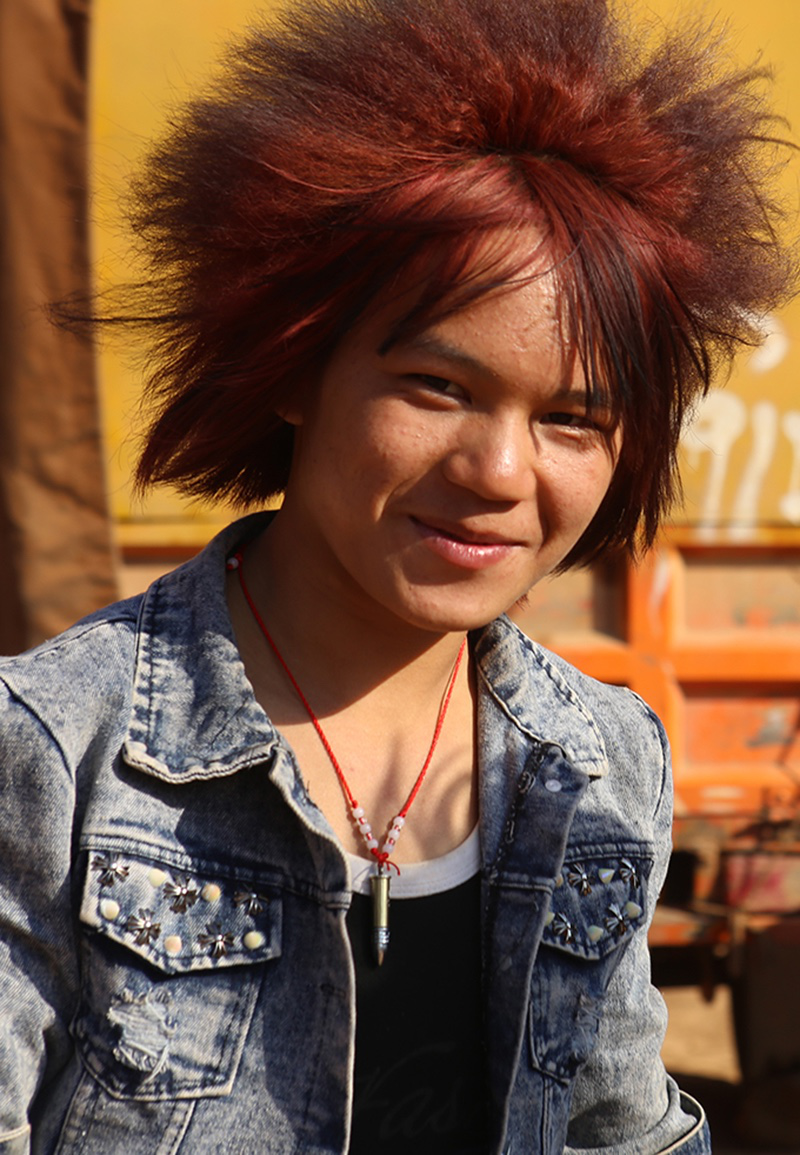 與女性不一樣,這里的男性不講究穿苗服。大多數(shù)苗族年輕男子如今都在城里打工,他們更愿意展現(xiàn)自己個性時髦的一面,印有外文字母的休閑衣服受到格外的歡迎。新潮的西服皮鞋,嬉皮的休閑牛仔,紋身,墨鏡,耳釘,項鏈……我發(fā)現(xiàn)幾乎所有的年輕男子都會在自己的頭發(fā)上做點文章,而今年的潮流似乎偏向夸張的美感。
