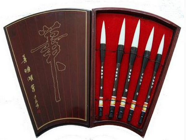 湖筆的第三個特點是品種多。目前以用途可分書寫繪畫、工業(yè)、特用三大類用筆;以性能分有軟、硬、兼三類。這三類所用的筆料就有十多種獸毛及其它禽羽等為原料,像硬毫中的黃鼠狼(鼬尾)、石獾、馬尾、豬鬃、山兔以富強性,落墨勁有力流利見長,軟毫的羊毫長而穎銳,運軟圓渾圓含墨飽滿,枯潤適用得當(dāng)則墨色筆意變化無窮。兼毫則剛?cè)嵯酀藭水?。如似大小長短粗細來分那就有數(shù)百種之多,這和中國許多毛筆產(chǎn)地品種都類似的。