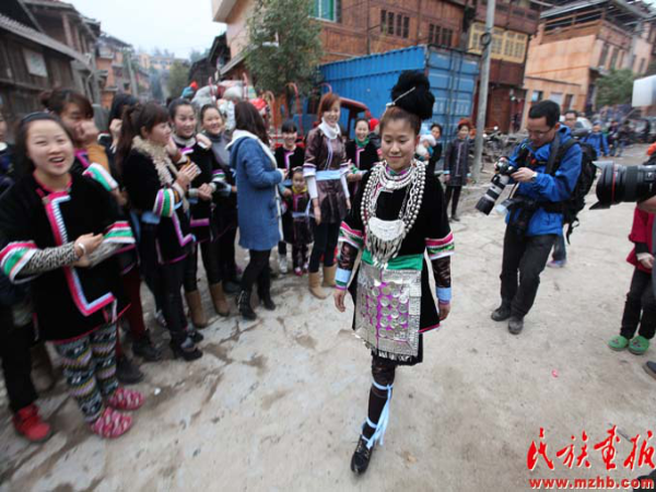 新娘走秀和鬼師做法是婚禮儀式的一項主要內(nèi)容。新娘走秀在第一天上午九時舉行,這是新娘唯一向眾人展示自己的機會也是婚禮中最為隆重的儀式,這時街心廣場及道路兩側(cè)擠滿了看熱鬧的群眾。之前新娘們都要精心打扮一番,穿上嶄新漂亮的傳統(tǒng)衣裙,戴上各種銀飾,然后在親人的目送下離開家門。新娘走秀與漢族結(jié)婚的迎親有很大不同,沒有新郎伴娘的陪伴,更沒有車水馬龍的迎親隊伍,只是一人獨身前行。鬼師做法在新娘登場后進行,我們只是見到了鬼師做法后留下的一些物品。