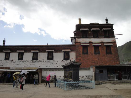在狹長的盆地上,各式建筑星羅棋布,金瓦紅墻,雕梁畫棟,華麗非凡。僅圍墻就長達3公里余。五百多間連續(xù)回廊及一千多個“嘛呢轱轆”,將寺院與外界隔絕。整個寺院外部墻垣、院地、臺階均以石砌為主,內部戶限、柵欄、棟梁、門栓均以木料為主,故有“寺院外不見木,內不見石”的說法。