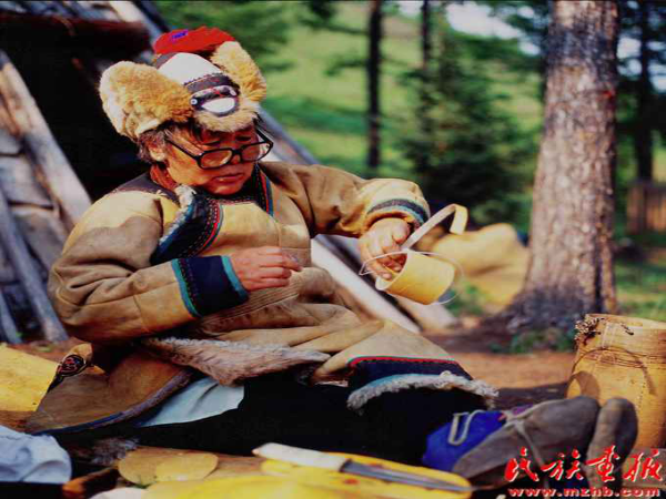 由于鄂倫春族生活在北半球高寒地帶,一年冰雪期長(zhǎng)達(dá)7個(gè)月,最低氣溫可達(dá)零下45度以下,所以他們的服飾首先要解決御寒問(wèn)題。另外,鄂倫春長(zhǎng)期游獵于山林之中,追逐獐狍野鹿、翻越崇山峻嶺都要求他們服飾結(jié)實(shí)耐磨。獸皮滿足了保暖與耐用這兩個(gè)條件。狍皮服飾在鄂倫春服飾中所占比重最大,這一方面是因?yàn)樵诙鮽惔荷畹牡赜蚺圩拥臄?shù)量很多,“傻”狍子又很容易獵獲,另一方面也是因?yàn)橛门燮ぶ谱鞯姆棞嘏?、柔軟。與現(xiàn)代人穿皮草時(shí)的“毛朝外”不同,從御寒性考慮,鄂倫春人的皮袍永遠(yuǎn)是“毛朝里”。動(dòng)物的皮經(jīng)過(guò)加工以后,如果不加任何的漂白劑,皮子就會(huì)泛黃,再經(jīng)過(guò)日曬,黃色會(huì)越來(lái)越深。鄂倫春婦女在制作色彩鮮艷的婚服和節(jié)日服裝時(shí),她們會(huì)特意用朽柞木煮水,將皮子染成黃色,然后在襟口、袖口、前胸和后背縫上繡有云紋、植物紋和各種動(dòng)物圖案的繡片。鄂倫春男子愛(ài)戴用狍頭皮縫制而成的狍頭帽,這種帽子用狍子本來(lái)的黃色皮毛,有的還將兩只角保留下來(lái)。獵人打獵的時(shí)候,微露狍頭帽,儼然像一支狍子臥在那里,誘惑狍子或其他以狍子為獵食對(duì)象的野獸,具有很高的欺騙性。此外,鄂倫春族信仰薩滿教,薩滿服是用黃色鹿皮制作的,再加上黃色銅鏡,整套薩滿服給人的感覺(jué)以黃為主。