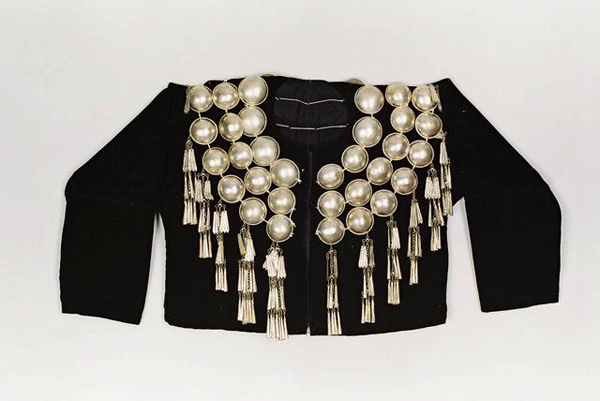 民族文化宮博物館收藏的這件銀飾“孔雀衣”,是景頗族女子盛裝時(shí)的一種服飾,征集于云南省德宏傣族景頗族自治州隴川縣,時(shí)間為20世紀(jì)50年代。這件銀飾“孔雀衣”長40厘米,胸圍108厘米,黑色平絨布制作而成,圓領(lǐng)對襟,領(lǐng)部、肩部和胸部墜銀泡、銀鏈、銀穗裝飾,黑白兩色相映成趣,精致華美。銀泡為三圈,由里至外逐圈增大,里層銀泡直徑約2厘米,最外層銀泡直徑約3厘米。外圈銀泡每個(gè)上墜有三角型銀片打制的銀穗,每串分三層,每層分別掛2、4、6個(gè)不等的三角型銀片。整個(gè)上衣幾乎被銀泡、銀鏈和銀穗遮蓋,穿上銀飾“孔雀衣”,銀泡在太陽的照射下銀光閃閃,行動(dòng)起來身動(dòng)銀搖,悅耳動(dòng)聽。