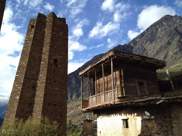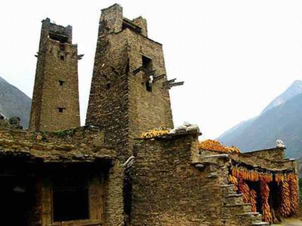 在羌語(yǔ)中,碉樓被稱為“邛籠”,意為美麗、高貴的房子,早在2000年前《后漢書(shū)·西南夷傳》就有羌族人“依山居止,壘石為屋,高者至十余丈”的記載。碉樓的高度在十米至三十米之間,用于御敵、貯存糧食和柴草。碉樓有四角、六角、八角幾形式,有的高達(dá)十三四層。建筑材料是石片和黃泥土,墻基深1.35米,以石片砌成。石墻內(nèi)側(cè)與地面垂直,外側(cè)由下而上向內(nèi)稍傾斜。修建時(shí)不繪圖、吊線、柱架支撐,全憑高超的技藝與經(jīng)驗(yàn)。建筑穩(wěn)固牢靠,經(jīng)久不衰。自唐朝來(lái),羌族人民因各種原因向西北遷移,到了西藏和青海,所以現(xiàn)在,羌族碉樓也往往被稱為藏族碉樓。
