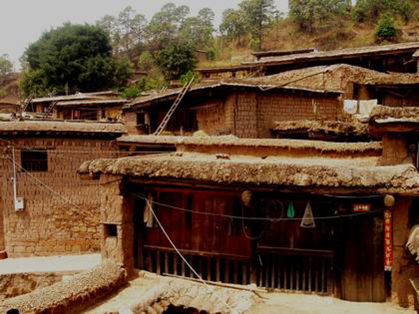 彝族是農(nóng)牧兼營的民族,村寨的分布與坐落有其獨特的傳承。彝族的村寨多坐落在海拔2000~3000米的山區(qū)、半山區(qū),相沿聚族而居。為適應(yīng)西南地區(qū)亞熱帶氣候和山地特點,彝民們便就地取材,以一種最容易、最節(jié)省錢財人力的建房方式,創(chuàng)造出中國建筑的獨特樣式——土掌房。土掌房多建于山地斜坡上,以石為墻基,用土坯砌墻或用土筑墻,墻上架梁,梁上鋪木板、木條或竹子,上面再鋪一層土,經(jīng)灑水抿捶,形成平臺房頂,不漏雨水。有的大梁架在木柱上,擔(dān)上墊木,鋪茅草或稻草,草上覆蓋稀泥,再放細(xì)土捶實而成。