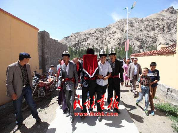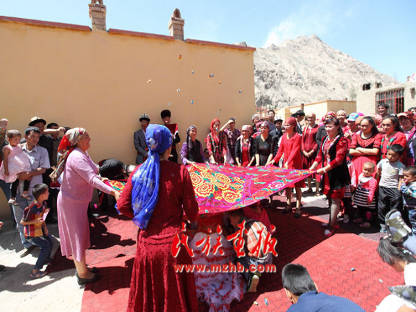 不一會(huì)兒,外面熱鬧聲一片。原來是迎親隊(duì)伍來了!只見新郎用一塊紅布遮住了臉,在眾人的簇?fù)硐?,緩慢前行。新郎的左右站了三位伴郎,他們一邊走,一邊唱起柯爾克孜族最具代表性的民間口頭文學(xué)“約隆歌”。每走幾步,新郎都會(huì)伴著歌聲的旋律和手勢鞠一下躬。新郎和伴郎腰間各系有一塊紅布,他們邊走,后面幾個(gè)新娘家的姐妹就要不時(shí)抓住他們腰間的紅布,往后拉一下,盡量不讓他們走得太快。其原因是希望他們多唱歌、多鞠躬,以表達(dá)對女方的尊重。
