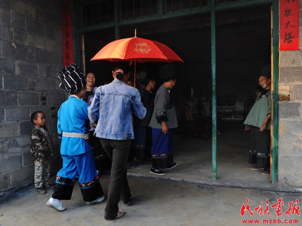 姑娘出嫁必須有娘家人陪送,婚禮這一天清早,“新娘”便在“接親客”的帶領(lǐng)和送親隊(duì)伍的陪同下,一路歡聲笑語 ,浩浩蕩蕩向“新郎”家走來。走到新郎家村邊,有的燃放鞭炮,一直燃放到新郎家門口,請新郎父母出來開門;無鞭炮準(zhǔn)備的,則在寨邊稍候,由迎親伙伴飛報(bào)新郎家做好迎親的準(zhǔn)備。男方父母聽到后,多數(shù)是很高興地喊醒家中兒女,由新郎的妹妹或堂姐妹為迎親主體,加上寨上的姐妹和房族組成迎親隊(duì)伍,打開大門,把新娘迎進(jìn)家來。接親的主要儀式是接傘。接傘的人必須是新郎的小妹或堂妹。無親妹、堂妹者則由新郎父母指定一與新郎同輩份的小姑娘去接。新娘走至大門,即由新郎的妹妹跨出門外迎接新嫂子,新嫂子接著用左手把雨傘遞給接傘的妹妹,接傘妹妹接過新嫂子手中的雨傘后,新娘即用左腳跨進(jìn)屋內(nèi),以示今后成為新家庭的主婦。隨即由接傘妹妹攜新娘手迎入新房,迎親婦女們陸續(xù)進(jìn)入新房休息。入門后,新郎家的“陪娘”及姑娘們便熱情地安排“送親客”團(tuán)團(tuán)圍坐,并簇?fù)碇靶履铩本o靠堂屋中柱子就坐,意為“新娘”從此當(dāng)家立業(yè),將來就像中柱子一樣,頂大梁,撐起這個(gè)家。
