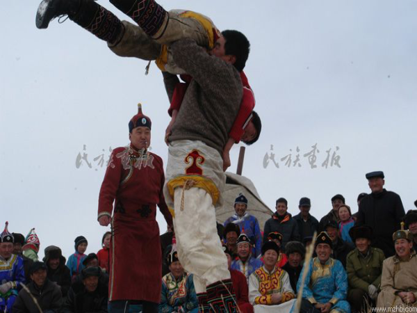 春節(jié),蒙古人稱為“白節(jié)”、“大年”,是蒙古人傳統(tǒng)節(jié)日,時間在農(nóng)歷正月初一。居住在農(nóng)村、城市、工礦區(qū)的蒙古族過春節(jié)的習(xí)俗同漢族差不多,但牧區(qū)有許多不同的特點(diǎn)。除夕之夜為“守歲”,合家老小席地坐在蒙古包中的矮桌周圍,桌上擺著一盤盤香噴噴的肉類、奶食品,以及糖果、香煙、美酒等物,有的還要在矮桌上供一張大紙,紙上寫著祖先的名字。午夜,開始飲酒吃年飯,或吃除夕餃子。按規(guī)矩團(tuán)圓之宴要多吃多喝酒、肉,食器要擺滿滿一席。如吃不完也要剩得越多越好,象征新的一年里吃喝不盡、年年有余。家里的年輕人,要向長者敬“辭歲酒”。特別有意思的是全家共吃一塊由酥油、糖、白面烙成的大圓餅,這叫吃新年餅,每人只吃一口,意思是全家永不分離,永久團(tuán)圓,永遠(yuǎn)過甜甜蜜蜜的日子。除夕之夜要?!案吕尽保ㄍ嫜蚬穷^)、說書、唱歌、跳舞,通宵達(dá)旦,熱鬧一宿。過大年,按習(xí)慣還要拜年,大年三十晚上為辭舊歲禮, 初一早上為迎新年,晚輩給父母和老人叩頭、敬酒、獻(xiàn)哈達(dá),祝老人們身體健康,晚年幸福!老人擁抱孩子們,并斟上一碗鮮奶,祝愿子女們幸福,像牛奶一樣純潔。大年初一早餐后,男女盛裝,三五成群來到浩特(村鎮(zhèn)),挨家串戶給親友拜年??腿诉M(jìn)屋首先向長輩叩頭拜年,祝愿老人身體健康,年豐人壽。按習(xí)慣由主人家的女婿向客人逐個敬酒,每敬必喝,或邊喝邊唱,邊唱邊舞。