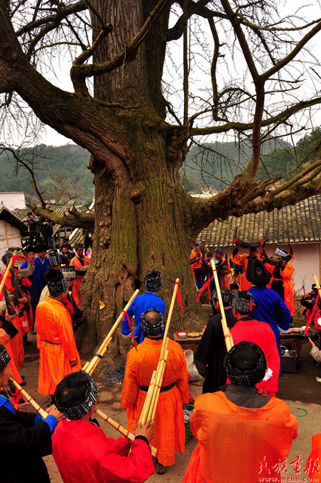 寨老引領眾人來到寨中央的千年銀杏樹下進行祭樹,寨老高舉牛角、男人們吹起蘆笙圍著古樹轉(zhuǎn)圈,司儀唱起“古歌”祈禱
