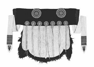 剪裁時,將羊皮修剪成U型,上部橫鑲一段黑氆氌(毛織品)或黑呢子,內(nèi)襯天藍色棉布。其下用七對白色鹿皮條穗縫綴并列的七個小圓形彩線繡花布盤,肩部縫綴兩個大圓形彩線繡花布盤。羊皮上端縫釘兩條繡花白布長帶,帶端還繡有花鳥、魚蟲、動物、植物、幾何等圖案,據(jù)說是象征納西族人民如蜂似蝶地奔忙,以辛勤勞動換取甜蜜生活。
