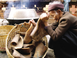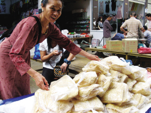 傣族老阿媽出售半生半熟的泡牛皮