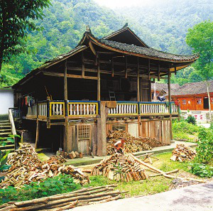 一般先建正房,再依經(jīng)濟(jì)條件和家庭需要續(xù)建吊腳樓。吊腳樓卯榫連接,結(jié)構(gòu)嚴(yán)謹(jǐn),檐角伸展高翹,雕刻精美。底層有柱無(wú)壁,主要拴牲畜、堆放雜物,有的人家將廁所設(shè)在那里;二層以上為客房、書(shū)房、閨房,或是閨女專門(mén)做針線活的場(chǎng)所。木樓通風(fēng)干燥,四周設(shè)廊道,用椿木雕刻的花格欄桿可晾曬衣物。土家族的山歌唱出了吊角樓的氣勢(shì):“土家起棟轉(zhuǎn)角樓,一截伸到天里頭,你若想要上天去,還要走段下坡路”。