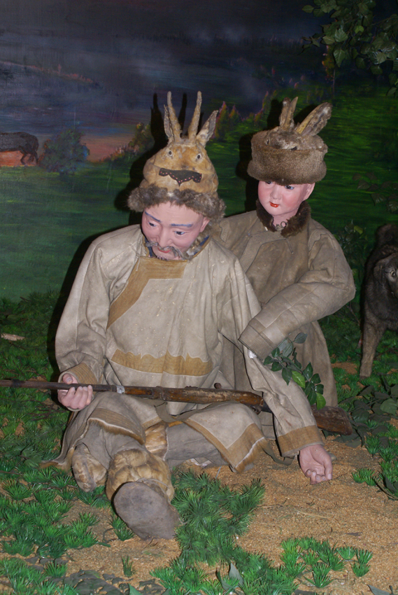 狩獵經(jīng)濟(jì)在鄂倫春族社會(huì)中維持了幾千年,一人一匹獵馬一桿槍,再加上幾條獵狗和一片獵場,幾乎就是鄂倫春族的全部生產(chǎn)力。而槍支的傳入也不過才300多年的歷史,在此之前使用石塊和木棒狩獵,后來發(fā)明了扎槍和弓箭,與外界幾乎隔絕,純粹的食獸肉、衣獸皮。鄂倫春族最早使用的獵槍是被稱做“俄羅斯鳥槍”的火槍,這是清朝的察邊官吏、外民族及俄國商人交換給他們的。有火繩槍、火鐮槍和泡子槍三種,都是從槍筒裝入火藥或鉛彈,只是引爆方式不同。民國以后陸續(xù)傳入俄國造的連珠式和“三八”式、“七九”式等現(xiàn)代步槍。槍支的傳入,使鄂倫春人有了剩余產(chǎn)品,于是出現(xiàn)了交換經(jīng)濟(jì)。每年五月的“楚勒罕”集會(huì)時(shí),鄂倫春、鄂溫克、達(dá)斡爾等狩獵民族要向清廷貢貂,經(jīng)朝廷官員檢驗(yàn),不合格者可以在集會(huì)上進(jìn)行互市。此時(shí),他們也帶一些其他的獵產(chǎn)品及手工藝品進(jìn)行交換。由于鄂倫春人所貢貂皮質(zhì)量最好,故朝廷對(duì)他們采取了特別的納貂辦法:每年派一名專職人員到鄂倫春地區(qū)代表官府征收貂皮、發(fā)放賞賜。這些專職人員被稱為“諳達(dá)”,他們代表官府征收貂皮的同時(shí),也自帶一些糧食、布匹和其他生產(chǎn)、生活用品與鄂倫春人進(jìn)行私下交換。后來,“諳達(dá)”變成了泛指進(jìn)山進(jìn)行獵產(chǎn)品收購生意的所有商人。“諳達(dá)”與鄂倫春人進(jìn)行交換時(shí)從不計(jì)價(jià),而是以“馬馱”為計(jì)量單位,雙方以同樣一馬馱的物品進(jìn)行互換,或者采取包干制的辦法,一個(gè)“諳達(dá)”固定幾個(gè)包攬戶,按期供給他們生產(chǎn)和生活必需品,包攬戶將所有的剩余產(chǎn)品交于“諳達(dá)”。隨著貨幣經(jīng)濟(jì)的發(fā)展,清末時(shí)期,鄂倫春族周邊地區(qū)出現(xiàn)了眾多商號(hào)商鋪,這些商號(hào)(鋪)的老板被稱為“老客”,他們同鄂倫春人進(jìn)行計(jì)價(jià)交換。同時(shí)還出現(xiàn)了一些進(jìn)行計(jì)價(jià)交換的行商,被稱為“跑老客”。鄂倫春人雖然受到“諳達(dá)”、老客和跑老客的瘋狂欺詐和層層盤剝,但在與他們的交換中,卻自覺或不自覺地打開了封閉的自然經(jīng)濟(jì)大門,朝著商品經(jīng)濟(jì)邁進(jìn)了一步(鄂倫春博物館展覽攝影:劉軍)。