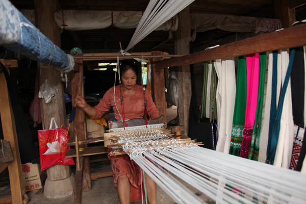 傣錦具有嚴(yán)格的制作工序。第一道工序為上漿。傣錦所選用的材料為天然麻棉,上漿可以讓麻棉線的韌性加強,不會起毛,這一步對以后織傣錦的過程有非常重要的影響。先將麻棉用專門調(diào)制好的米漿浸泡一天兩夜,再放到蒸籠蒸,蒸的時侯要注意不斷小心地翻動,以保證米漿完全均勻地浸入棉紗,令到棉線的粗細(xì)一致。第二步是曬棉紗。即把蒸好的棉紗放在太陽底下暴曬,在曬的過程中需要由專人隨時檢查,把結(jié)在一起的棉紗一根根分開來,這樣在紡線的時侯棉線才不會因為線粘在一起而斷掉。最后把曬好的線繞成線團(tuán)。第三步是拉經(jīng)線。拉經(jīng)線也是傣族織錦中非常重要的一道工序。在拉線的時候,所需要的場地非常大,因為線一拉一般都有八九十米長,為保持所有的線在拉的時候不會亂掉,只能在沒有太大的風(fēng)的天氣才能進(jìn)行,讓整個傣錦制作過程又增加了難度。在拉經(jīng)線的整個過程,都必須由有經(jīng)驗的老藝人來組織,打樁,計算經(jīng)線的長度,而且必須控制好在拉經(jīng)線的過程中棉線的松緊度。否則在織傣錦的時侯會有花紋傾斜,圖案錯亂等問題。整個拉經(jīng)線的過程需要由7-8個老藝人一起來完成。第四步是編花和上機。傣錦是一種古老的手工紡織工藝,圖案的設(shè)計是通過熟練的紡織技巧創(chuàng)造出來的,多是單色面,用緯線起花,對花紋的組織非常嚴(yán)謹(jǐn),織造時傣族婦女將花紋用一根根細(xì)繩系在“紋板”(花木)上,用腳蹬手抬的動作使經(jīng)緯形成上下兩層后開始投緯,如此反復(fù)循環(huán)便可織成十分漂亮的傣錦。設(shè)計一幅傣錦,需幾百乃至上千根細(xì)繩在“紋板”上表現(xiàn)出來,倘若結(jié)錯一根細(xì)線,就會使整幅傣錦圖案錯亂,可見傣錦的工藝要求極高。