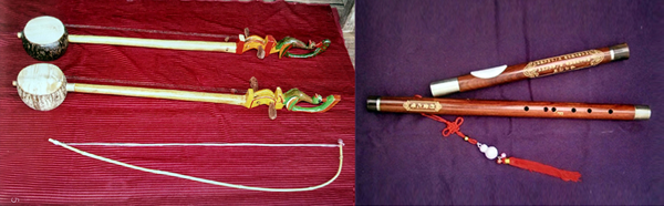 傣劇是在傣族民間歌曲和歌舞音樂的基礎(chǔ)上發(fā)展起來的,并借鑒了漢族戲曲藝術(shù)的表現(xiàn)手段,流傳于德宏、保山、臨滄等傣族聚居區(qū)。傣劇包括多種男女唱腔,男腔多用羽調(diào)式,女腔多用徵調(diào)式。20世紀(jì)50年代以來,傣劇吸收了多種傣族民歌和舞曲,豐富了唱腔,增強(qiáng)了音樂的表現(xiàn)力。傣劇唱腔基本是上下句組成的樂段及其變化反復(fù)。由于唱詞字?jǐn)?shù)可多可少,因此唱腔樂句長短不一。過去,傣劇只用小堂鼓、鑼、镲等伴奏,后逐步采用了多種民族樂器及西洋管弦樂器,組成新型的傣劇樂隊。傣族的民族樂器屬于吹奏樂器的有篳、葫蘆簫(如圖)、豎笛、木葉等;彈撥樂器有玎琴、口弦等;弓弦樂器有西玎(玎琴)、牛角玎(牛角琴)等;打擊樂器有象腳鼓、光隆、光邊、光邦、鑼、镲等。象腳鼓、鑼、镲的合奏是傣族器樂合奏的主要形式。